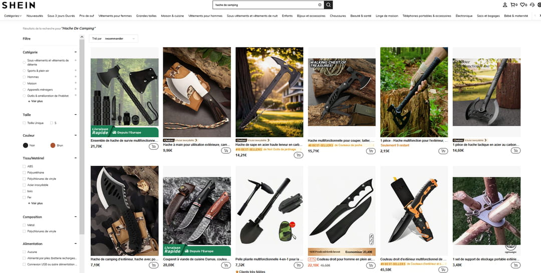Sur les trois plateformes chinoises, les produits vendus sont assez ambigus. On trouve effectivement des "haches de camping", des tomahawks ou des hachettes multifonctions, dont la forme ne correspond pas à la définition stricte d'une machette d'arme blanche. Dans les photos d'illustration et les descriptifs, les vendeurs mettent l'accent sur leur aspect utilitaire. Toutefois, certains mettent explicitement en avant leur côté tactique, défensif et survivaliste, un aspect qui est souvent renforcé par le design de l'arme (forme agressive, couleur noire, finitions "survie"...), ce qui peut potentiellement les rapprocher de ce qui pourrait être examiné comme arme blanche. Mais il n'y a effectivement que sur Shein où nous sommes tombés sur un produit présentant toutes les caractéristiques d'une machette.
