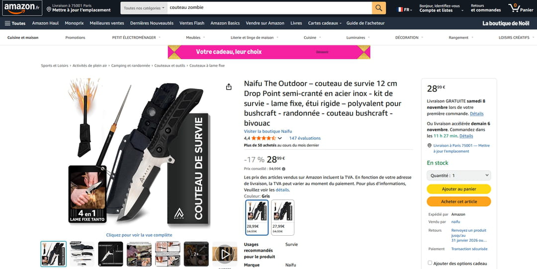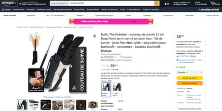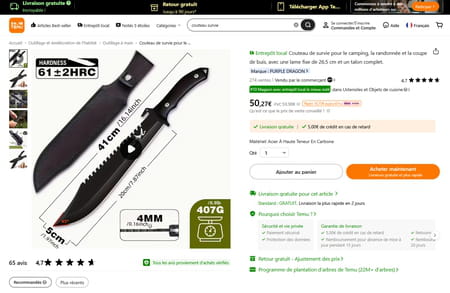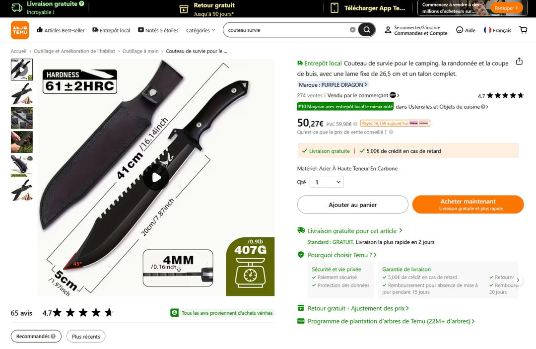 C'est la même chose pour les fameux couteaux zombies. Shein et AliExpress se contentent de vendre des couteaux de survie pliants, ce qui leur permet d'échapper à la qualification d'arme de catégorie A. En revanche, nous sommes parvenus à en trouver des non-pliables sur Amazon et sur Temu, même s'ils ne présentent pas de trous dans la lame – ce simple détail esthétique peut-il suffire à les disqualifier ?