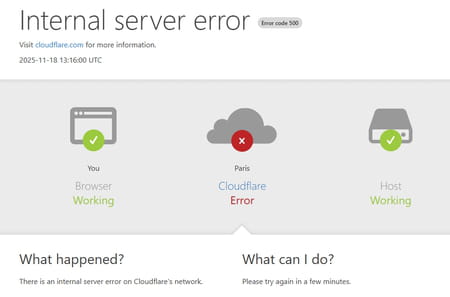 C'est la panique chez les utilisateurs, particuliers comme entreprises, confrontés à des pages blanches et des messages d'erreur, certains affichant de cryptiques informations de Cloudflare, certains évoquant une mystérieuse vérification. Et, malheureusement, après une légère amélioration en début d'après-midi, la situation a continué se dégrader. Mais depuis 16 h, heure française tout semble rentrer dans l'ordre.