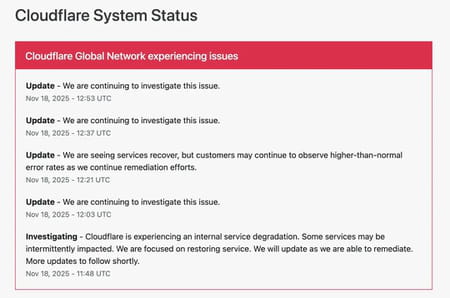 L'entreprise elle-même a reconnu l'incident peu avant midi, précisant qu'elle "identifiait un problème susceptible d'affecter plusieurs clients" et qu'une enquête était en cours. Les détails restent flous, mais la gravité de la situation est visible sur des plateformes comme DownDetector, où des milliers de signalements témoignent d'un impact mondial. De manière ironique, DownDetectoir est lui même impacté, car il utilise aussi les services de Cloudflare !