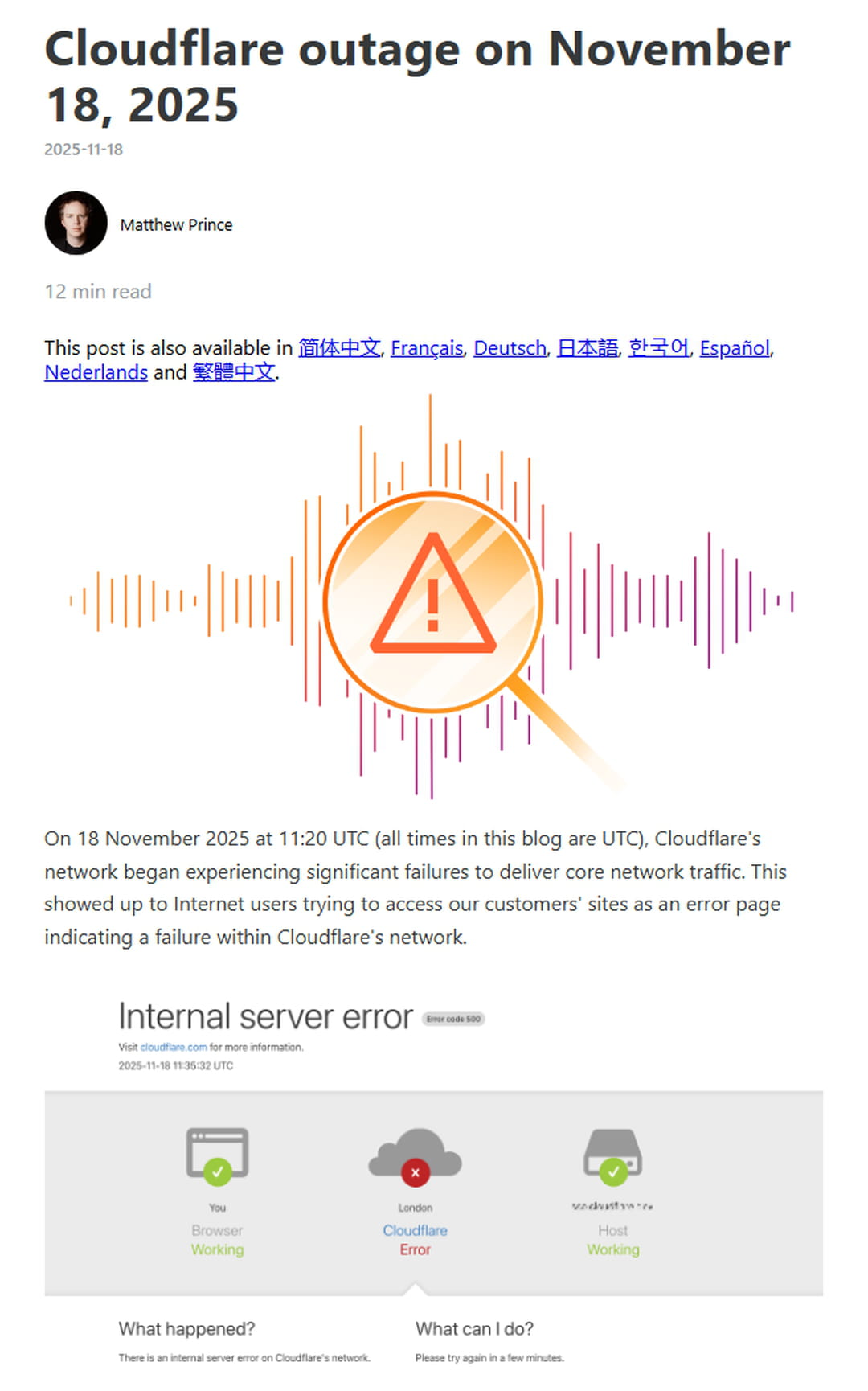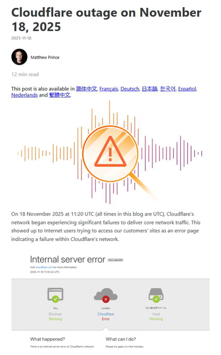 Le mardi 18 novembre 2025, des milliers de sites et de services Internet sont devenus inaccessibles à cause d'un problème chez Cloudflare, un intermédiaire essentiel au fonctionnement du réseau mondial. L'entreprise s'explique sur cette panne historique.