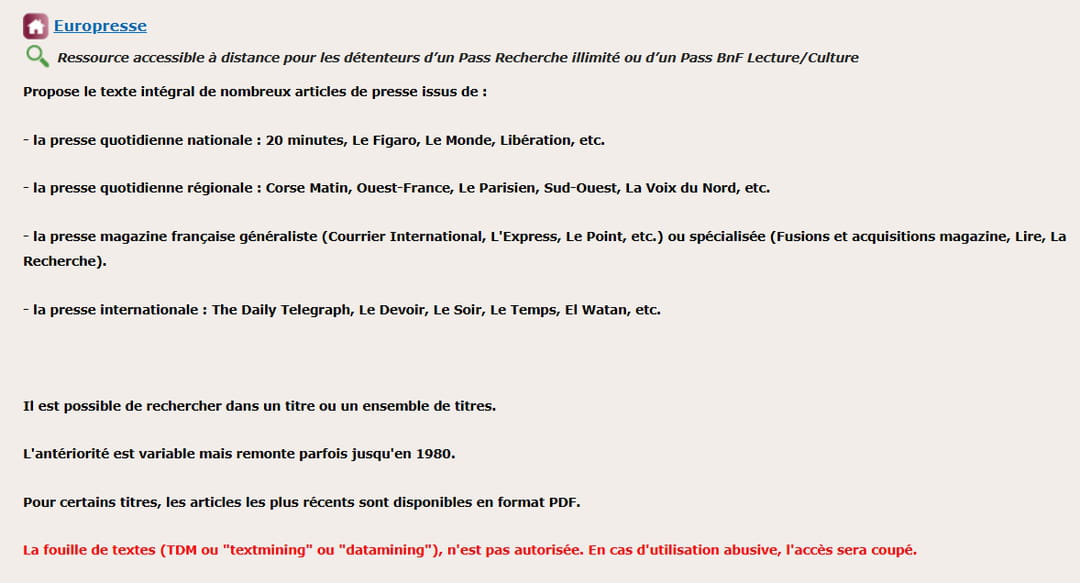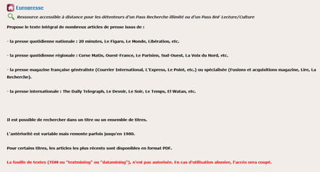 - Europresse : plus de 10 000 titres d'information française et étrangère. Vous y trouverez des grands titres nationaux (Le Monde depuis 2001, Le Figaro, L'Est républicain, etc.) et internationaux (The Economist, Vanity Fair, The Washington Post, The Guardian, etc.), et des magazines spécialisés (Télérama, Science et Avenir, etc.) ;