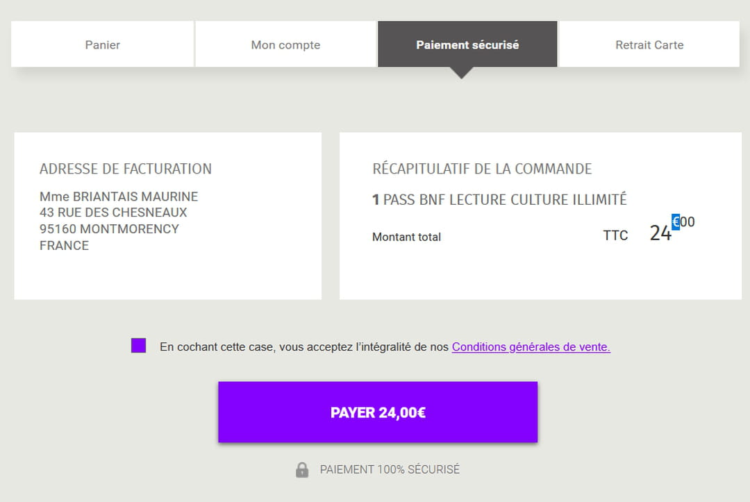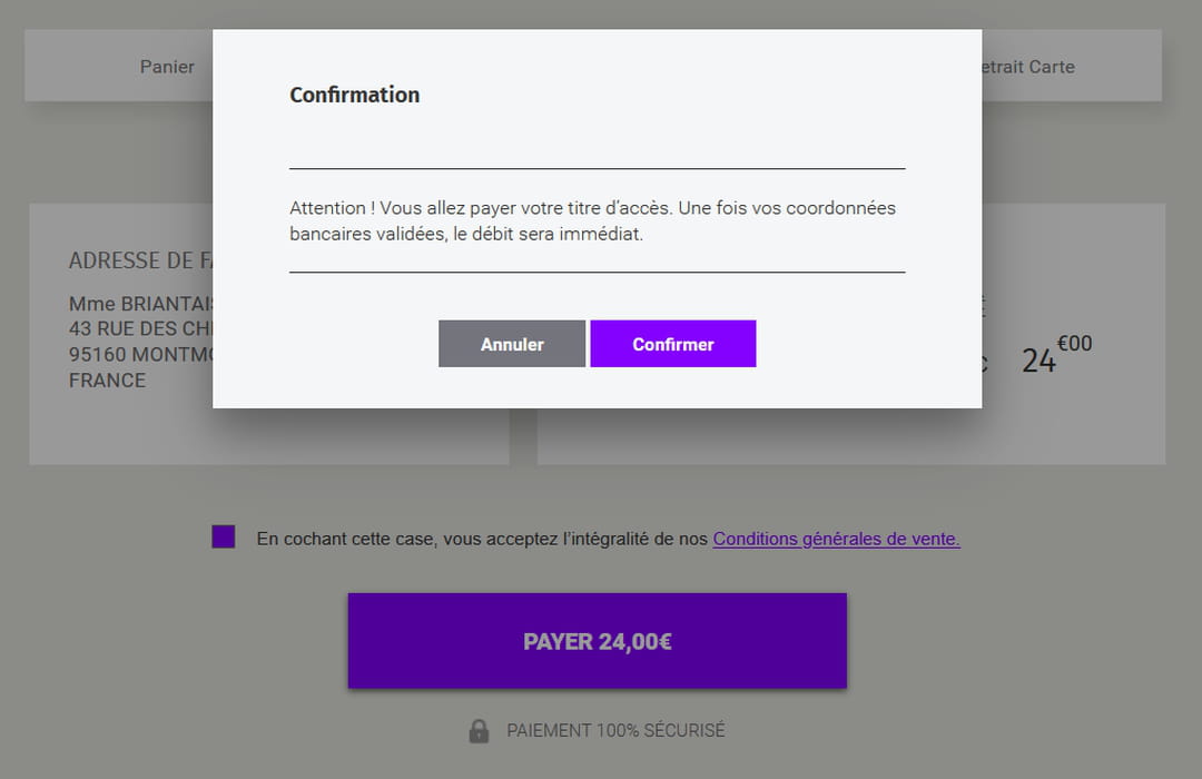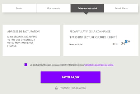 ► Une fois connecté à votre compte, retournez à la validation du paiement, en cliquant sur l'icône du petit panier, tout en haut à droite de l'écran. Après avoir cliqué sur le bouton Valider mon panier, comme précédemment mentionner, une nouvelle fenêtre s'ouvre. Cochez la case de Conditions générales de vente, et cliquez sur le bouton violet Payer 24,00€.