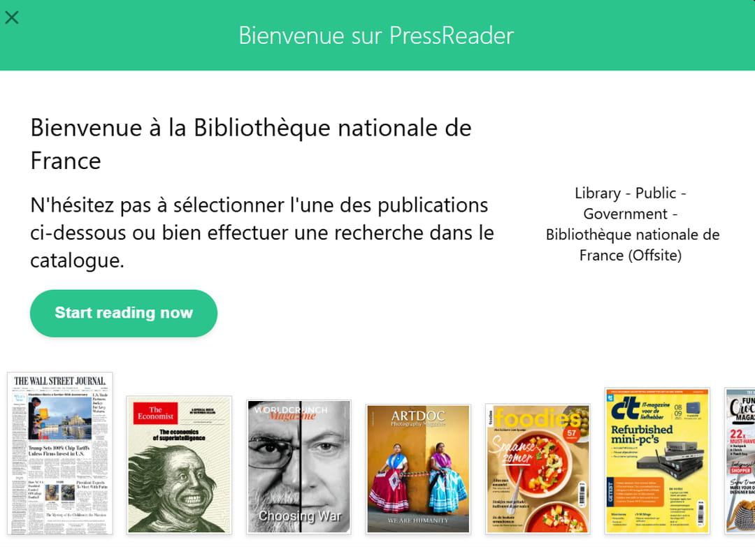 ► Vous êtes redirigé vers le site de Pressreader. Normalement, une fenêtre pop-up vous indique que vous êtes connectée via la BNF. Cliquez sur Start reading now pour commencer votre navigation. Bonne lecture !