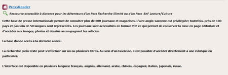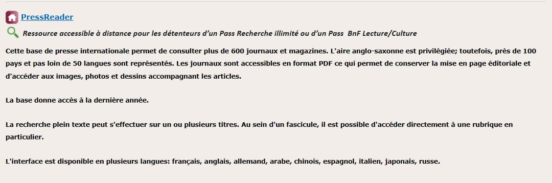- PressReader : près de 3500 titres internationaux dans plus de 60 langues – attention, cela nécessite un premier passage dans les murs de la BnF pour l'activer ;