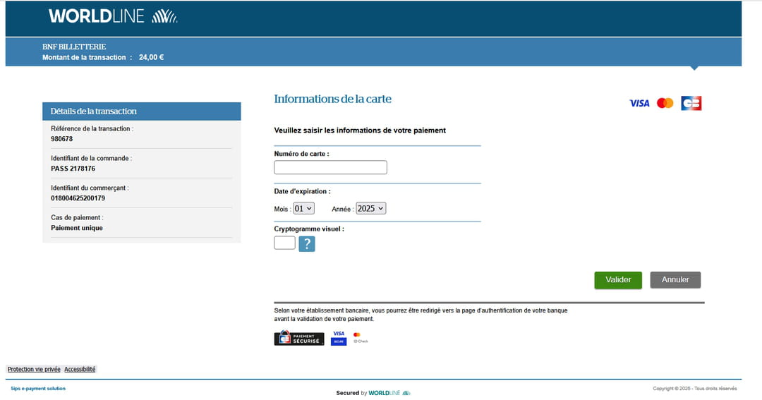 ► Vous êtes redirigé vers la page de paiement. Renseignez vos coordonnées bancaires et cliquez sur le bouton vert Valider.
