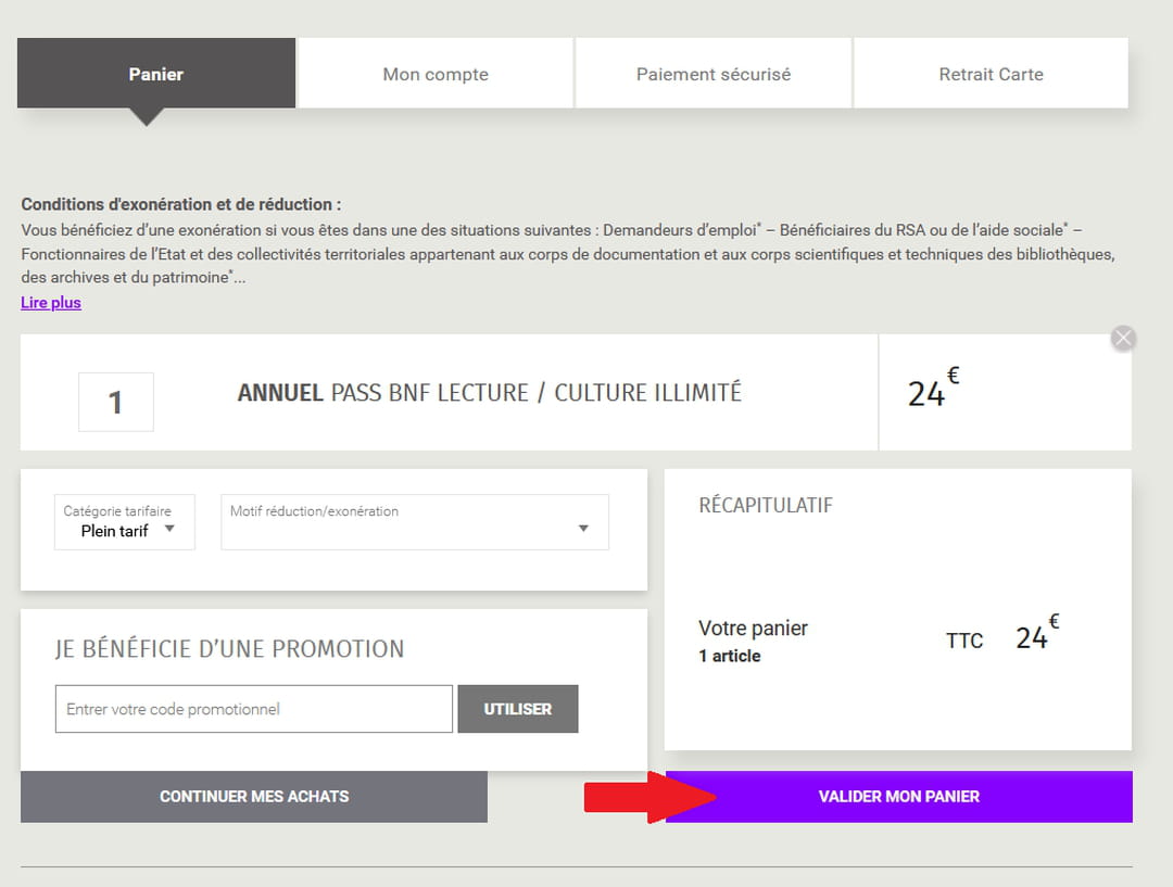 ► Une nouvelle page s'ouvre. Si jamais vous pouvez bénéficier d'une réduction tarifaire, cliquez sur le menu déroulant Catégorie tarifaire et sélectionnez celle qui convient à votre situation. Ensuite, cliquez sur le bouton violet Valider mon panier.