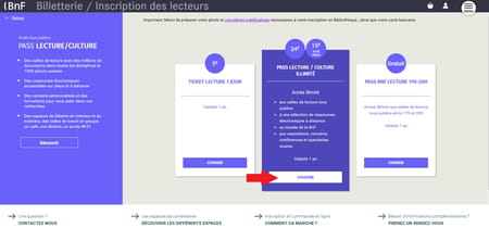 ► Rendez vous sur https://inscriptionbilletterie.bnf.fr et cliquez sur Pass Lecture/Culture, tout à gauche.