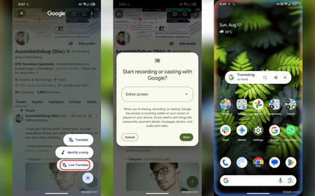 Cette fonction est encore en développement, elle est donc imparfaite, mais cela donne quand même un bon aperçu du potentiel de la fonction. Cela signifie également que, lors de sa sortie officielle, le rendu final pourra être différent. Pour l'utiliser, il faut appuyer sur le tiroir d'applications d'Entourer pour chercher et sélectionner Live Translate. Un pop-up apparaît alors pour savoir si l'utilisateur veut enregistrer tout l'écran du smartphone ou seulement certaines applications. La fonction s'active alors, avec une nouvelle animation et un dégradé arc-en-ciel sur les bords de l'écran.