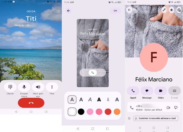 Enfin, dernière nouveauté qui vient tout juste d'arriver : les "cartes d'appel personnalisées", qui permettent de personnaliser l'affichage des contacts lorsqu'ils vous appellent. Pour chacun d'entre eux, vous pouvez désormais choisir d'afficher en arrière-plan une photo prise à l'instant, une image de votre galerie ou encore un cliché stocké dans Google Photos. L'outil offre aussi quelques réglages simples, comme le recadrage et la personnalisation du nom avec plusieurs polices et couleurs. Une fois définie, cette carte s'affiche en plein écran lorsque le contact vous appelle ou durant la conversation, juste au-dessus de la zone de contrôle de l'appel. Notons que cette personnalisation est strictement locale. Cette nouveauté est actuellement en cours de déploiement.