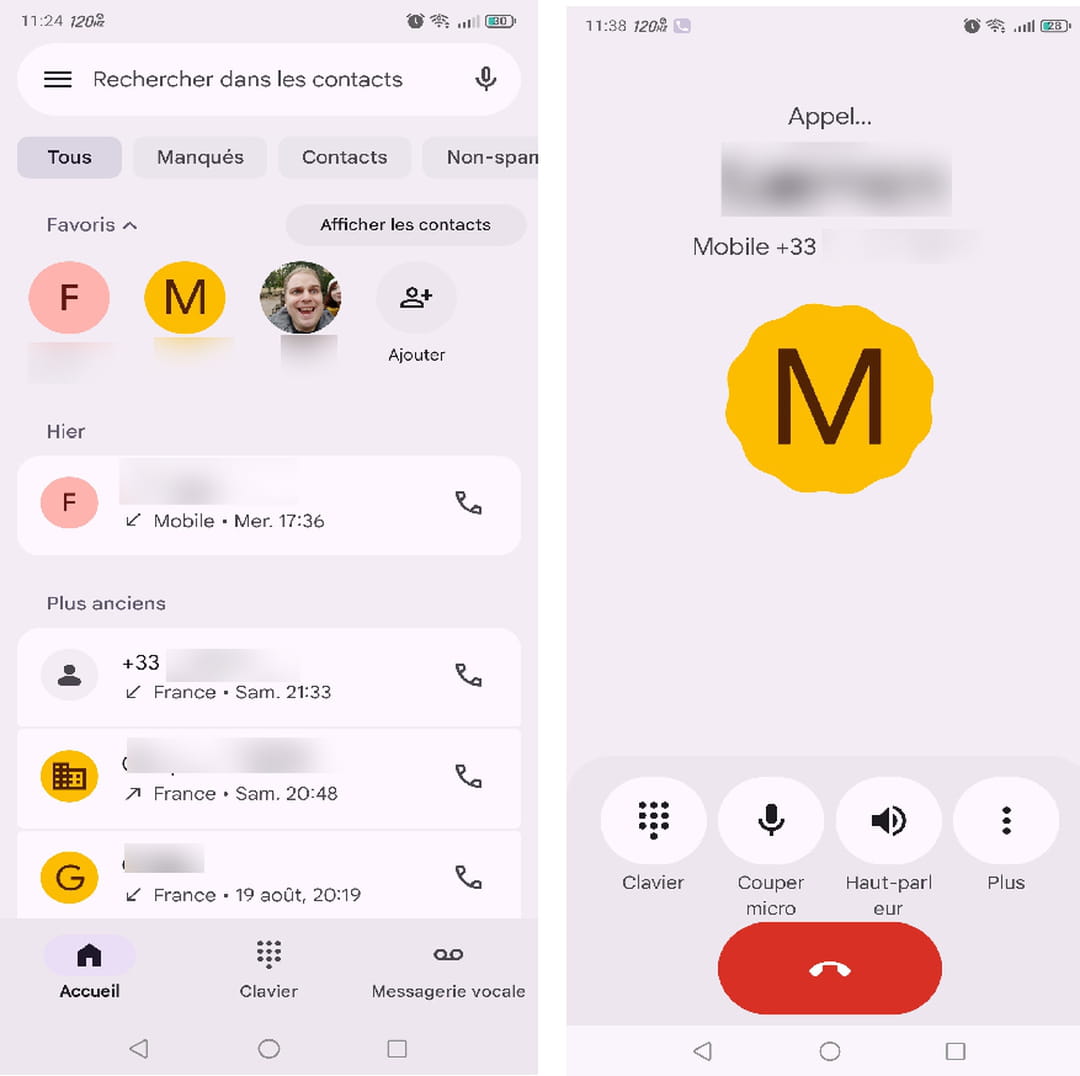 Faisant suite à des tests réalisés au mois de juin, les photos de contact apparaissent maintenant lors des appels dans une forme arrondie et ondulée, reprenant l'identité visuelle de Material 3 Express, et sont davantage mises en avant. Depuis peu, les boutons (Clavier, Couper micro, Haut-parleur, Plus) prennent quant à eux la forme de pilule plus grandes et arrondies, tandis que le bouton pour raccrocher se transforme en une imposante pilule d'un rouge vif, presque agressif et impossible à manquer. Autant dire que cet affichage surprend la première fois !