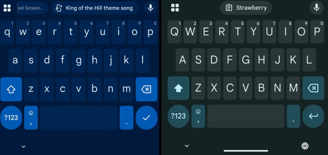Désormais, les suggestions du clavier sont placées dans des bulles en forme de pilule plutôt que dans des rectangles arrondis. Ceci s'applique à la fois aux suggestions de collage classiques du presse-papiers et aux fonctions comme Magic Cue – Aide magique – et Pixel Screenshots – Captures Pixel sur la série Pixel 10. Cette nouveauté est disponible auprès du grand public dans la version 15.8.4 de l'application.