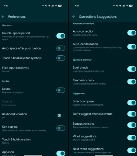 Enfin, la section "Correction de texte" devient "Correction et suggestions", et se divise désormais en quatre parties : corrections automatiques, orthographe et grammaire, suggestions, et outils d'écriture (sur Pixel 10 et QPR2 bêta, en remplacement de Relecture). Un nouvel interrupteur permet aussi d'activer et de désactiver la fonction "Suggestions de mots : Afficher dans la bande de suggestions". Ces modifications sont disponibles dans la version bêta 15.8.5 de l'application et ne devraient pas tarder à arriver sur la version stable.