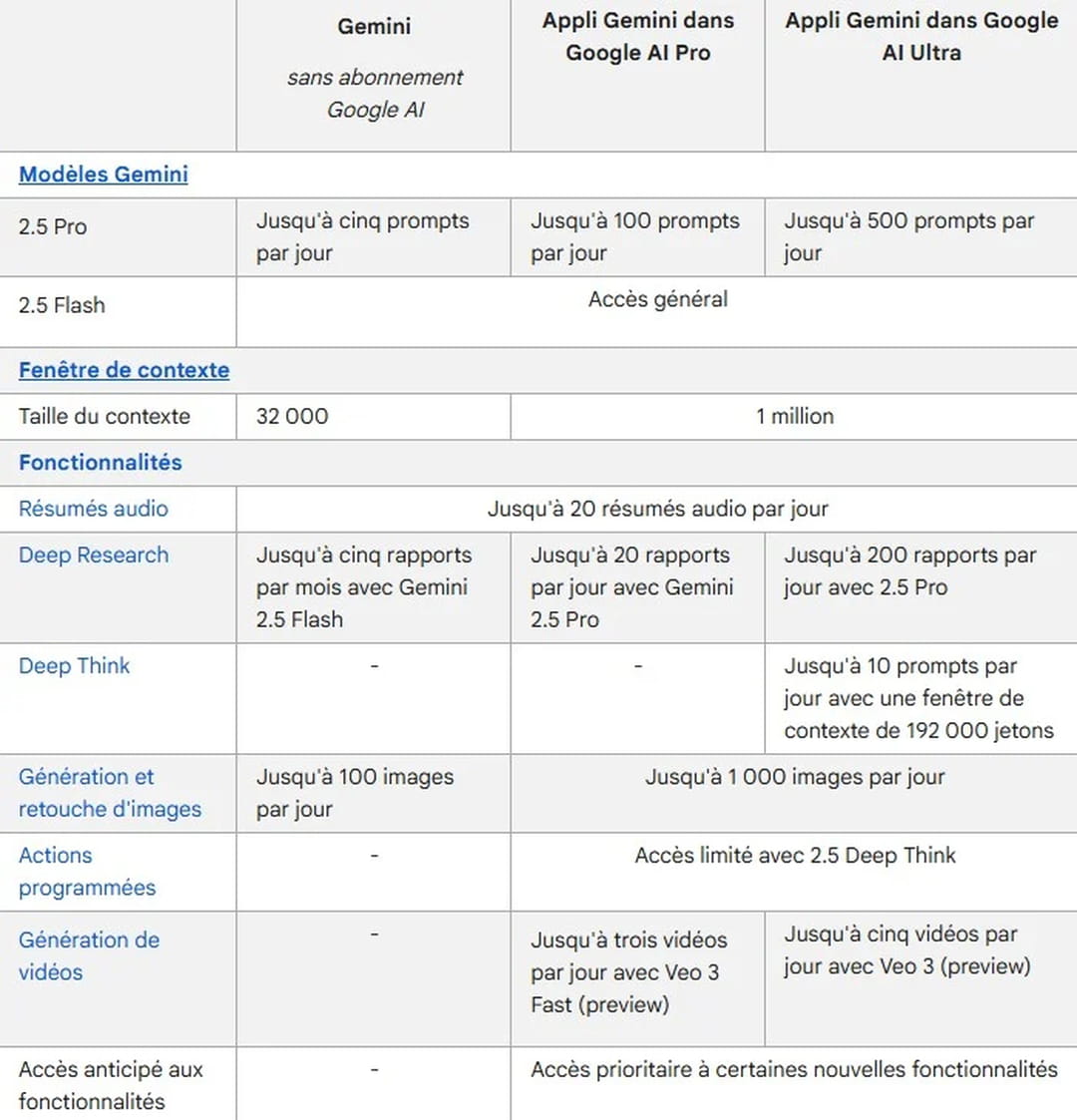 Pour rappel, Google propose trois formules distinctes, permettant d'accéder à plus ou moins de fonctions et de limites d'utilisation pour son IA Gemini : l'abonnement gratuit, l'abonnement IA Pro à 21,99 euros par mois, et l'abonnement AI Ultra à 274,99 euros par mois. Notons qu'ils offrent aussi différents avantages qui n'ont rien à voir avec l'IA, comme de l'espace de stockage, l'accès à YouTube Premium ou encore des fonctions exclusives dans Google Meet, mais nous allons nous concentrer ici sur les possibilités offertes en termes d'intelligence artificielle.