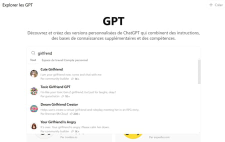 OpenAI n'est pas un pionnier en matière de discussions cochonnes avec une IA. Ainsi, on trouve dans le GPTStore, la boutique d'applications de l'entreprise qui permet de partager et de télécharger des versions personnalisées de ChatGPT, de nombreuses petites amies virtuelles. C'est bien simple, il suffit de taper "girlfriend" dans la barre de recherche pour trouver les chatbots en question : "Petite amie méchante", "Judy", "Ton ex-petite amie Jessica", "petite amie autoritaire", "chérie virtuelle"... Il y en a pour tous les goûts (voir notre article). Sinon, il n'y a qu'à se rendre sur le Play Store ou sur l'App Store pour télécharger une application du même genre. Certaines se sont carrément spécialisées dans la génération d'images et de vidéos "pour adultes" !