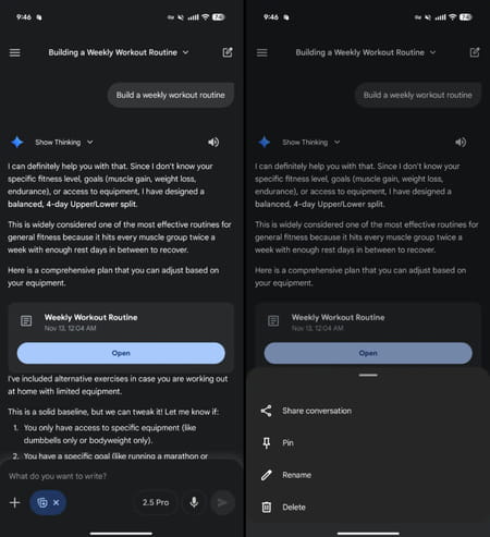 Enfin, les conversations ont droit à quelques modifications. Le bouton en haut à gauche permettant de changer de compte est remplacé par un nouveau bouton pour créer une nouvelle discussion, et le nom de la conversation permet désormais d'afficher un menu déroulant permettant de la partager, de l'épingler, de la renommer ou de la supprimer. Avant, ces actions n'étaient accessibles que depuis le menu de navigation, ce qui demandait plus de manipulations. Toutes ces nouveautés sont accessibles dans la version 16.45 de l'application sur Android et devraient bientôt arriver sur iOS et la version Web.