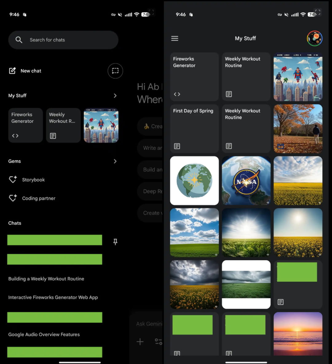 Gemini pour Android bénéficie d'une grande refonte de son interface, avec une nouvelle page d'accueil, un thème sombre vraiment noir, une nouvelle section "Mes contenus" et de nouveaux boutons pour les conversations.