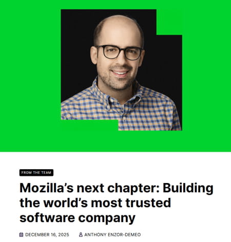 Depuis quelques jours, Firefox n'est plus seulement un navigateur Web. Du moins, c'est ainsi que Mozilla souhaite désormais le présenter. Le fondation a confirmé sa volonté de transformer Firefox en un navigateur largement appuyé sur l'intelligence artificielle, avec des outils capables de résumer des pages, d'assister la navigation ou de produire du contenu à la volée. Une orientation assumée par le nouveau patron, Anthony Enzor-Demeo, qui parle d'une évolution stratégique majeure face à la montée en puissance de l'IA dans tous les usages numériques dans un long billet de blog publié le 16 décembre 2025.