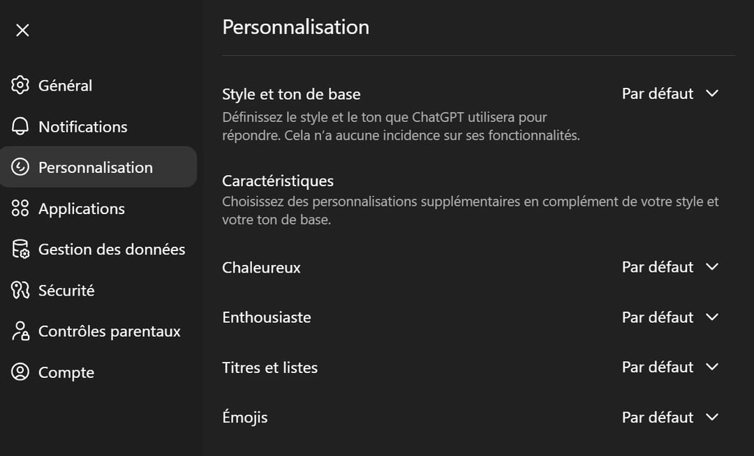 Cette option de personnalisation s'ajoute à la fonction déployée avec ChatGPT 5.1, qui permet déjà de calibrer la personnalité de l'IA ("Par défaut", "Professionnel", "Chaleureux", "Spontané", "Décalé", "Efficace", "Geek" et "Cynique") (voir notre article). Il suffit de se rendre dans la section "Personnalisation", accessible en cliquant sur son nom en bas à gauche de l'écran, pour y accéder.