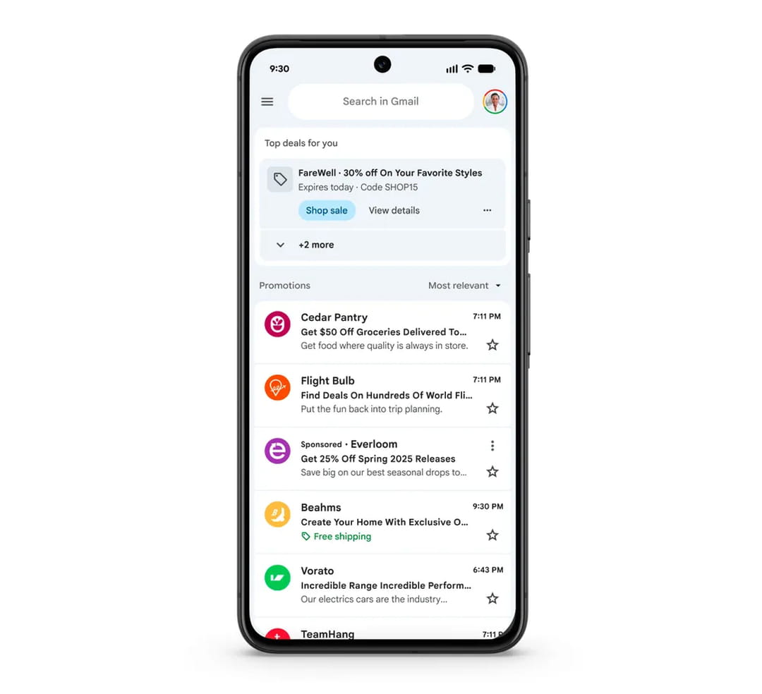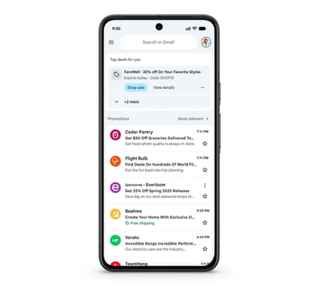 Gmail en profite également pour remanier sa catégorie 'Promotions". Celle-ci accueille désormais une option de tri "Les plus pertinents", qui affiche les expéditeurs et marques avec lesquels vous interagissez le plus. Ceux qui préfèrent afficher "Les plus récents" pourront toujours choisir cette option. Dans les semaines à venir, des notifications intelligentes viendront également mettre en avant les offres à venir et les promotions opportunes, afin que vous ne passiez pas à côté des bonnes affaires. Dépenser n'aura jamais été aussi simple et intuitif !