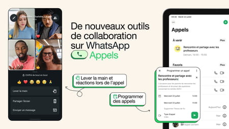 Il ne se passe pas un mois sans que WhatsApp ne reçoive de nouvelles fonctions ou des améliorations. Dernièrement, l'appli n'a cessé d'évoluer avec une foule de nouveautés, notamment pour ses appels audio et vidéo, de façon à convenir aussi bien aux discussions entre amis qu'à des usages plus professionnels. Après avoir amélioré la qualité sonore des appels, augmenté le nombre de participants et même accueilli une nouvelle interface, la messagerie instantanée accueille de nouvelles fonctions, comme la possibilité de planifier les appels, d'inviter les participants à l'avance, et de "lever la main" pour demander la parole. Un peu comme ce que proposent Zoom, Google Meet ou encore Teams, que Meta cherche clairement à concurrencer.