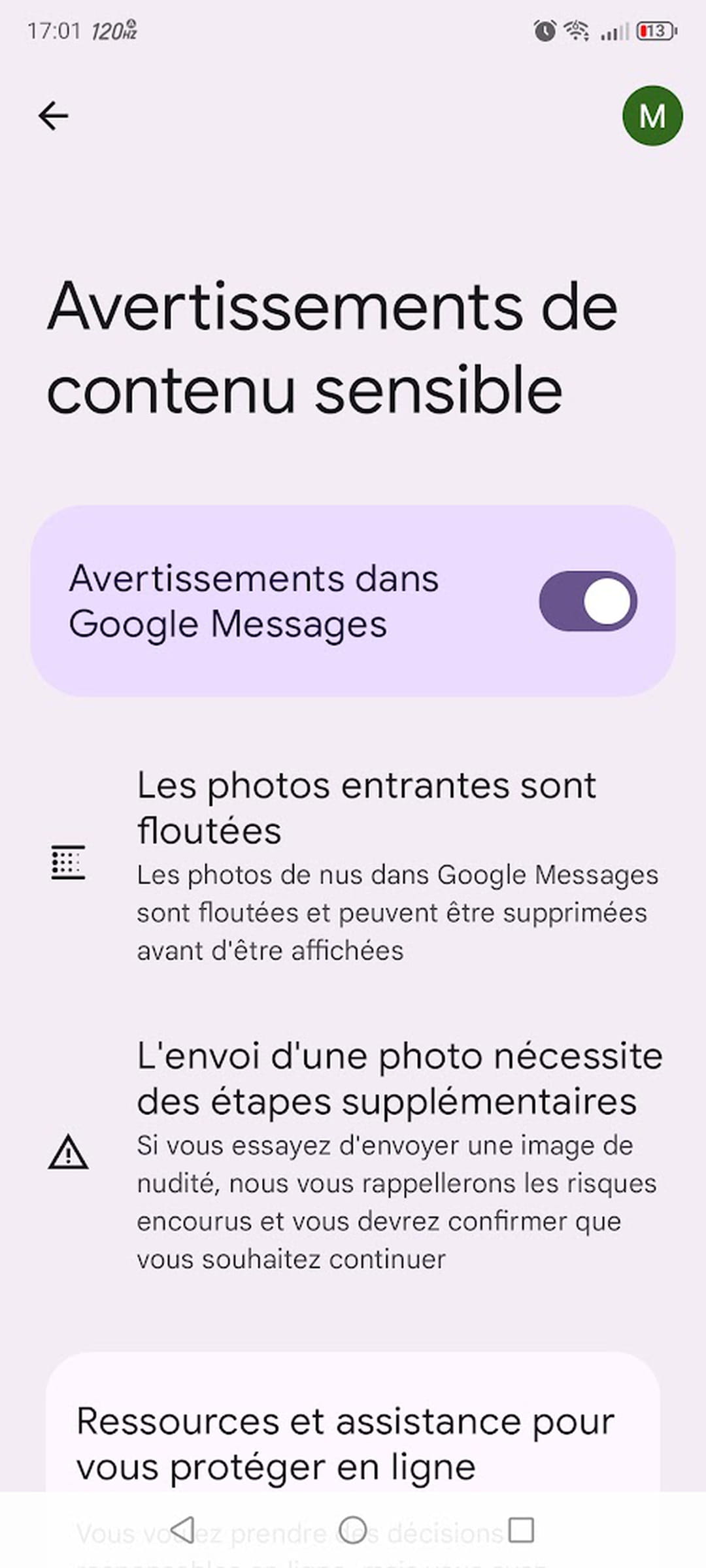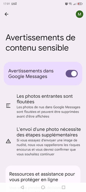 Cette fonction est activée par défaut pour les utilisateurs mineurs et ceux supervisés par leurs parents via Family Link. Pour les plus de 18 ans, elle est désactivée par défaut, mais il est tout à fait possible de l'activer manuellement. Pour cela, il faut se rendre dans les paramètres de Google Messages, en appuyant sur sa photo de profil ou son initiale en haut à droite, puis sur "Paramètres de l'application Messages". Il faut ensuite sélectionner "Protection et sécurité", puis "Gérer les avertissements de contenu sensible", pour enfin activer l'option "Avertissements dans Google Messages".