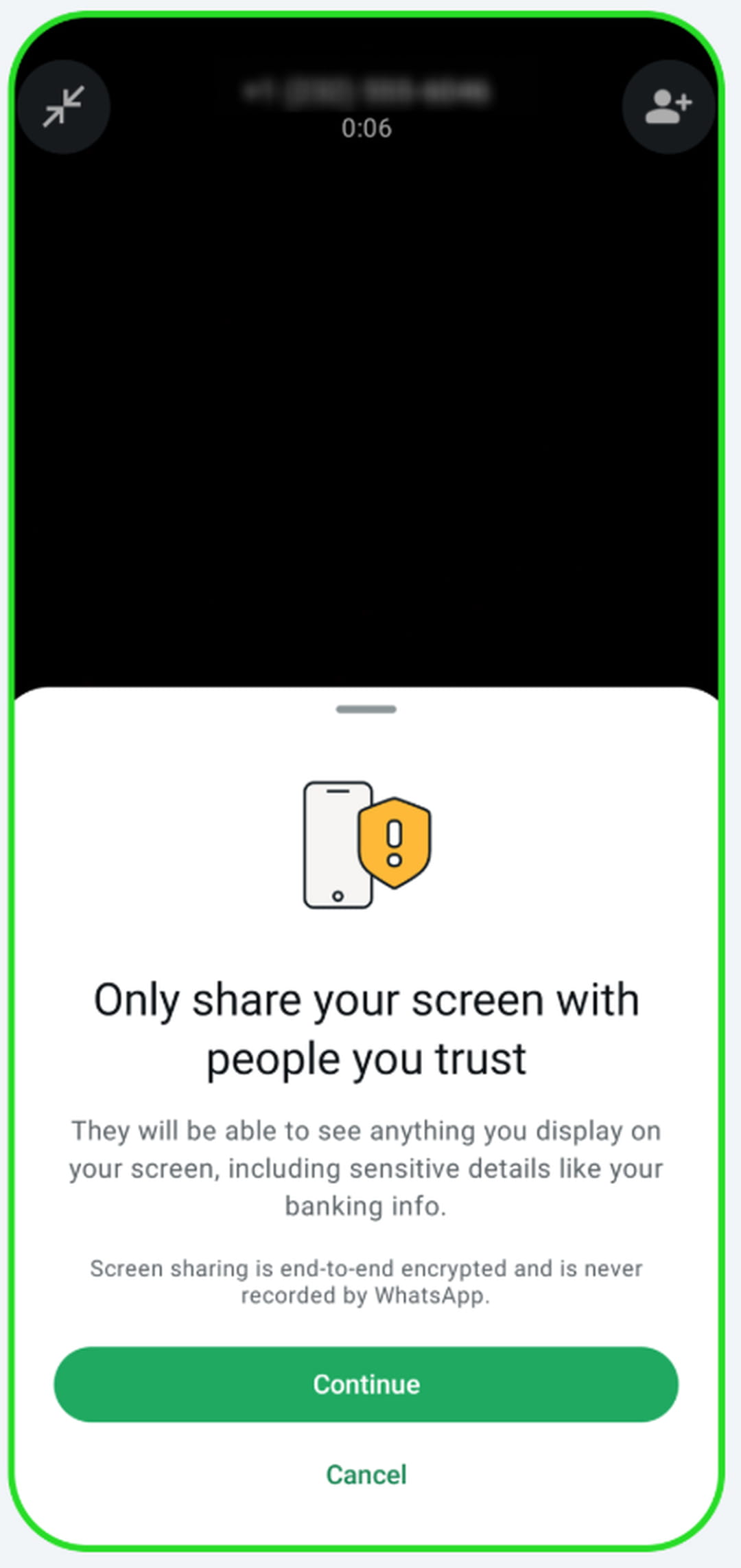 Pour tenter de pirater votre compte, des cybercriminels vous appellent en se faisant passer pour un contact de votre répertoire dont le compte a déjà été compromis. À la réponse, l'appel est en vidéo mais l'écran de votre correspondant reste totalement noir. Il vous explique qu'il rencontre un problème technique et, pour l'aider, vous propose d'activer le partage d'écran. Dès que vous l'activez, l'application vous envoie par SMS votre code de sécurité, qui s'affiche à l'écran par le biais de la notification. Le fraudeur s'en empare alors, modifie votre mot de passe et prend le contrôle de votre compte.
