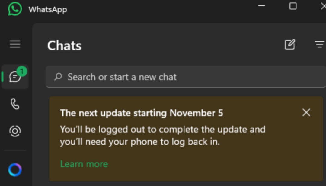 Selon les informations de Windows Latest, Meta a d'ores et déjà commencé à notifier les utilisateurs de l'application WhatsApp sur Windows 11 d'une mise à jour à venir le mercredi 5 novembre 2025, qui les déconnectera automatiquement et leur demandera d'utiliser leur smartphone pour se reconnecter. Le service restera donc accessible, mais il ne s'agira plus d'une version native, conçue spécifiquement pour Windows et garantissant de bonnes performances. Il s'agira à la place d'une réplique de la version Web de WhatsApp, mais encapsulée au sein d'une application intitulée WhatsApp grâce à la technologie WebView2, basée sur Chromium.