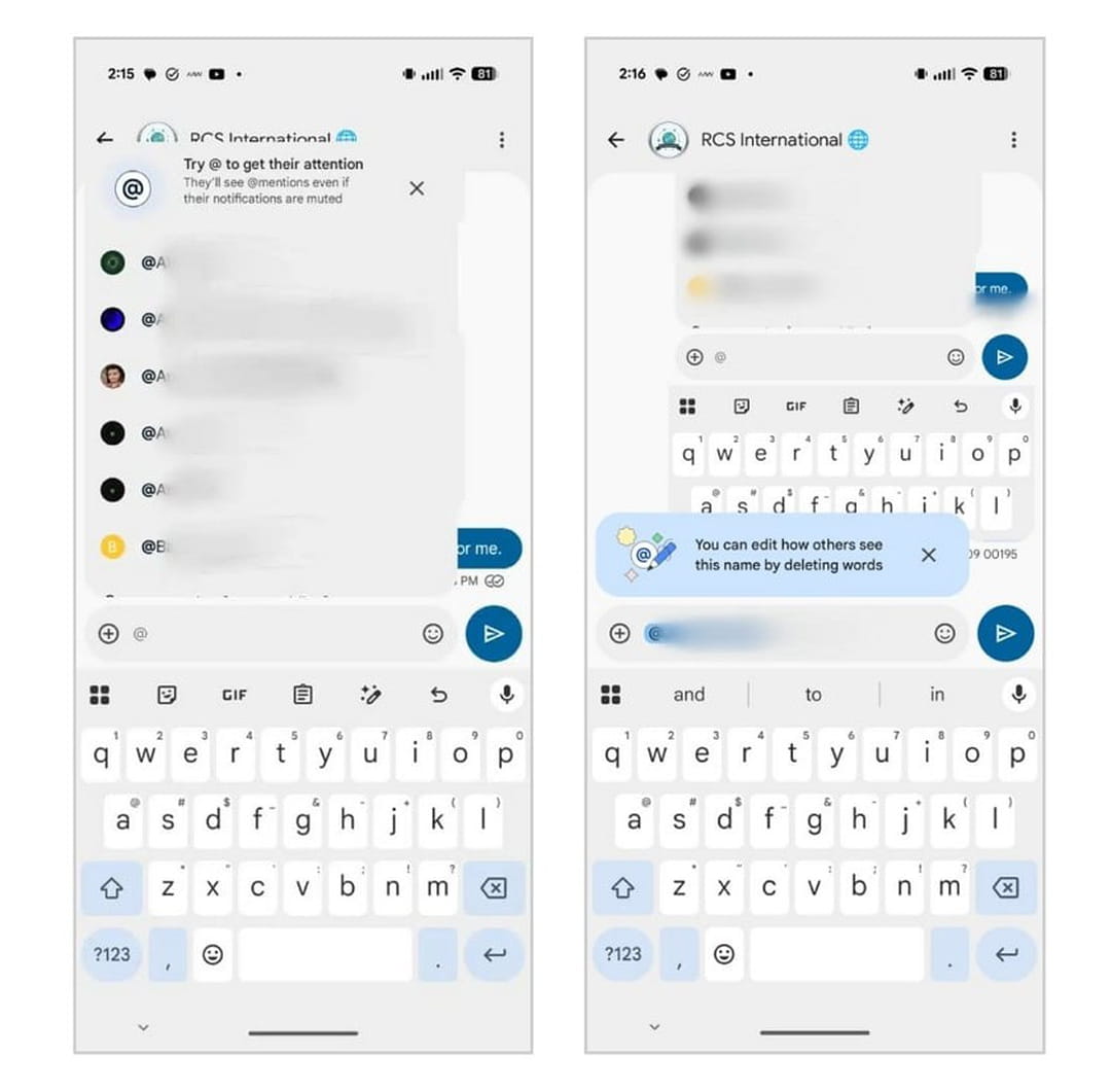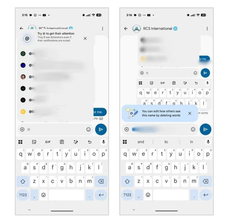 Son fonctionnement est similaire à ce que l'on trouve chez la concurrence. Ainsi, il suffit de taper "@" dans une conversation de groupe RCS pour accéder à la liste des participants pouvant être cités, en s'appuyant sur la liste de Google Contacts. S'il s'agit d'une personne qui n'y est pas enregistrée, son numéro sera affiché à la place de son nom.