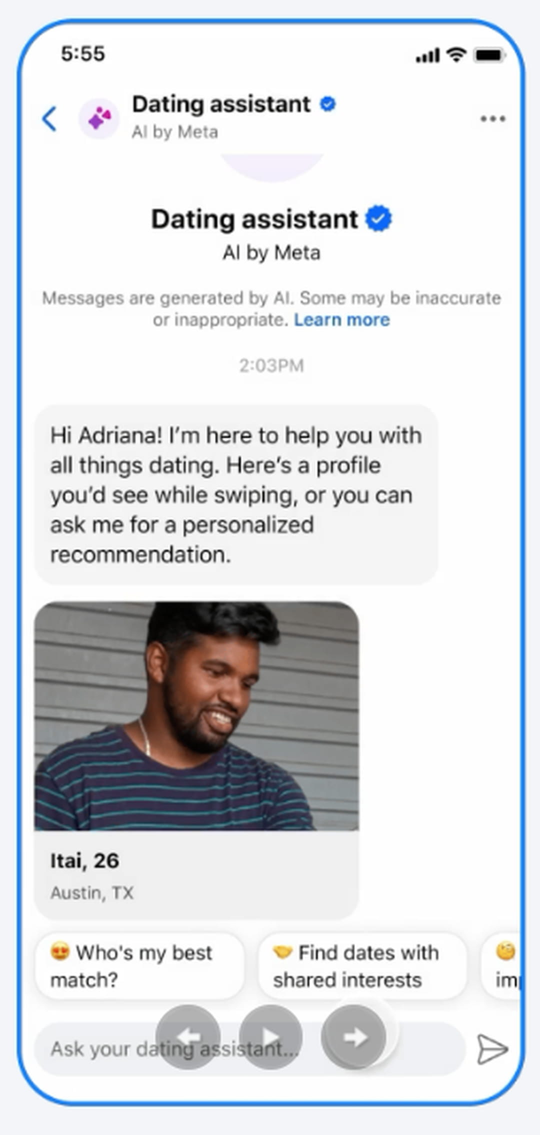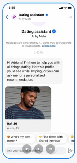L'un des objectifs de Meta est d'éviter que les utilisateurs passent des heures à balayer les profils les uns après les autres sans jamais passer à l'action. Aussi, la mission du chatbot sera de "trouver de meilleures correspondances en fonction de vos centres d'intérêt et préférences, en vous proposant une recherche affinée et des recommandations personnalisées." Concrètement, cela signifie que l'IA est capable de sélectionner des profils compatibles par le biais d'une simple requête personnalisée. On peut, par exemple, lui soumettre une demande du type "Trouve-moi une fille de Brooklyn dans le secteur des technologies" pour que l'outil sélectionne des profils répondant à ces critères.