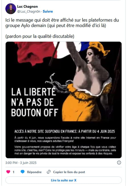 Aussi, dès ce mercredi, les trois plateformes afficheront un message pour expliquer la situation à leurs visiteurs, qui prendra la forme suivante : "Votre gouvernement propose de vérifier votre âge à chaque fois que vous visitez notre site, c'est fou, non ? Cela ne protège pas les mineurs - mais au contraire, cela met en danger la vie privée de tout le monde et expose les enfants à des risque". Concrètement, il s'agit ni plus ni moins qu'un coup de pression.