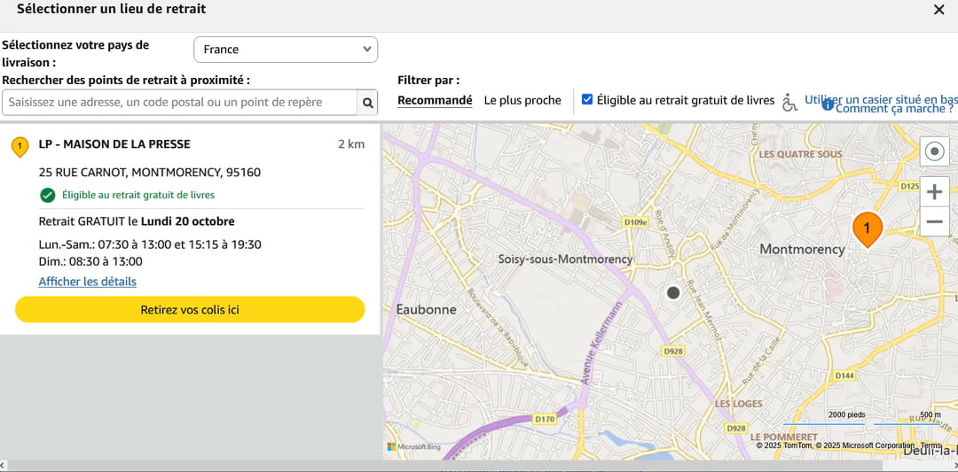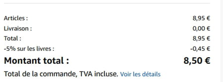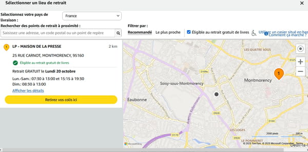 Attention, pour que la commande soit éligible, elle doit obligatoirement porter sur un panier composé de livres vendus par Amazon – et uniquement par lui, tous les titres sur la plateforme ne sont donc pas éligibles, loin de là. Ensuite, il faut bien cliquer sur son panier puis sur "Passer la commande", et non pas directement sur "Acheter maintenant" depuis la page du produit. Enfin, pour l'adresse de livraison, il faut choisir "Rechercher un point de retrait gratuit", puis en sélectionner un dans un commerce qui vend déjà des livres – tous les points de retrait ne sont pas éligibles. Et normalement c'est bon. Mais ça fait beaucoup de conditions quand même !