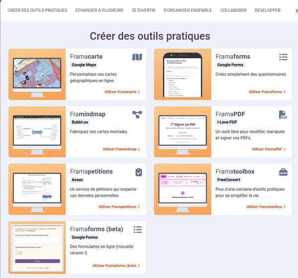 Depuis 2019, après un nettoyage et un recentrage, Framasoft propose ainsi une vingtaine d'outils destinés aux particuliers et aux petites structures, notamment aux associations, qui constituent une grande part de ses utilisateurs. Des services qui se posent tous en alternatives aux solutions proposées par les GAFAM – qui sont toujours indiquées à titre de références – et qui sont régulièrement mis à jour, améliorés et complétés, comme c'est le cas aujourd'hui.