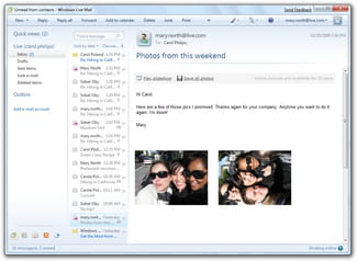 Windows Live Mail, il est possible de rechercher des messages dans plusieurs comptes à la fois. L'utilisateur peut également déplacer et classer les messages en un seul clic. Pour un aperçu des messages, le programme affiche une petite partie de ceux-ci dans le volet de lecture. Puisque les logiciels malveillants peuvent également entrer dans des messages pour ensuite infecter le PC,