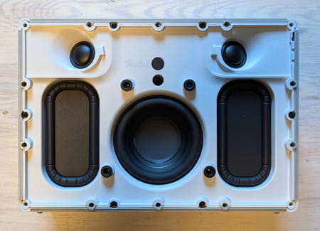 La partie acoustique est confiée à une paire de petits tweeters à dôme de 20 mm montés dans des amorces de pavillon associés à un unique boomer/médium de 90 mm à membrane en tissu. Cette section "active" – car alimentée par l'ampli – est complétée par une paire de petits haut-parleurs rectangulaires de 100 mm "passifs"– sans bobine ni aimant, donc – qui viennent épauler le transducteur central par simple compression mécanique. Un dispositif astucieux – mais pas exclusif à Teufel – qui permet de récupère des graves dans une enceinte close, un peu comme un évent le fait en bass reflex. L'ensemble fonctionne bien entendu en stéréo, sur deux canaux donc, même si l'électronique de type 2.1 assure une répartition sur trois voies – les trois haut-parleurs "actifs".
