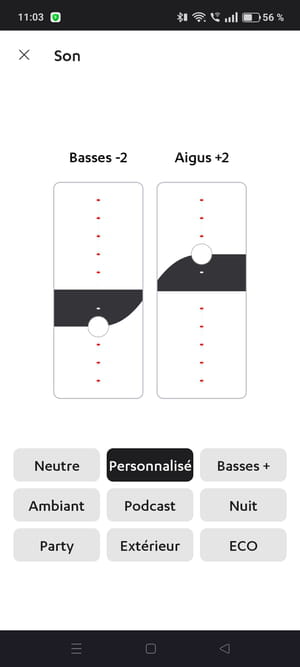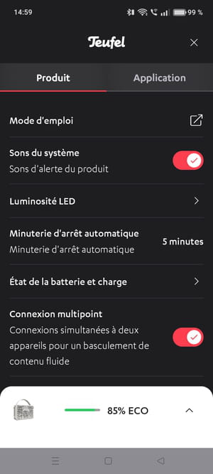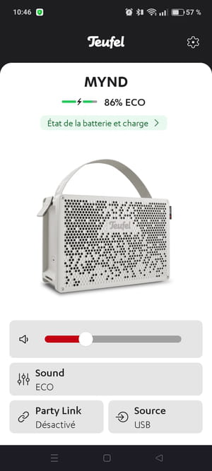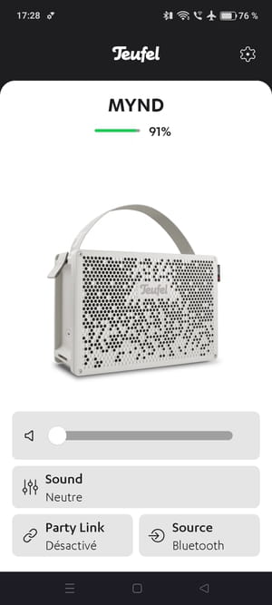 L'appairage Bluetooth est d'une simplicité exemplaire. Il suffit d'allumer la Mynd pour qu'elle se déclare automatiquement sur un appareil à proximité : on valide, et c'est tout ! Une opération à la portée d'une enfant. Il est alors proposé et conseillé de télécharger l'application Teufel Go qui permet d'ajuster quelques paramètres à distance, notamment la source (Bluetooth, Auxiliaire ou USB), le volume et l'égalisation, avec plusieurs présélections (Neutre, Ambiant, Nuit, Basse+, Party, etc.) dont une personnalisable – mais avec seulement des réglages de graves et d'aigus, soit le strict minimum.