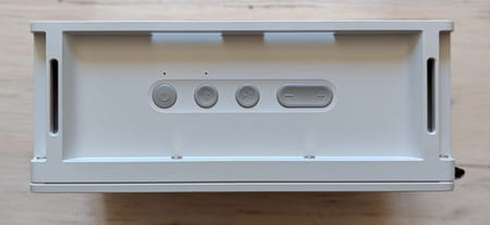 Côté commandes et connexions, Teufel a fait dans la simplicité. Le panneau supérieur accueille ainsi quatre gros boutons très agréables ç manipuler, accompagnés de Led témoin, pour les fonctions de base : Marche-Arrêt et niveau de batterie, Appairage Bluetooth et sélection de source, et Lecture/Pause/Suivant et Volume +/-. Rien de compliqué à comprendre et à utiliser.