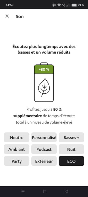 On peut aussi activer un mode Eco qui prolonge l'autonomie en réduisant le niveau général et le niveau des graves, et ajuster quelques options annexes comme la veille automatique. C'est aussi dans l'appli que l'on gère la connexion multipoints qui permet de jongler avec deux sources Bluetooth, en alternant facilement la lecture entre deux smartphones par exemple. Un plus très appréciable autorisé par la compatibilité de l'enceinte avec le Bluetooth 5.3. Signalons aussi la possibilité de passer en mode Party-Link, pour connectez jusqu'à 100 enceintes Mynd (ou Rockester Go 2) et créer ainsi un système de multidiffusion. Une fonction plutôt anecdotique en pratique, rares étant les personnes qui couplent plusieurs enceintes nomades.