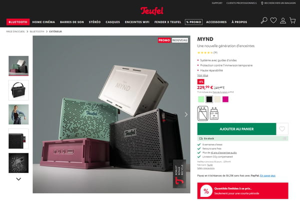 Au final, la Mynd tient plutôt bien ses promesses. Outre son aspect écologique, sa solidité et sa réparabilité, elle offre tout ce que l'on attend d'une enceinte Bluetooth portable, à commencer par une excellente autonomie. Et elle délivre un son "plein" très correct, comparable au meilleures références du domaine dans cette gamme de prix. Pour autant, comme sur les modèles concurrents, pas question de hi-fi, notamment à cause du manque de largeur stéréo : s'il plaira aux amateurs de "grosses" basses, le son reste moins raffiné, moins défini que sur un véritable système audio haute fidélité. Pour avoir mieux, il faut mettre quatre fois plus cher, dans des modèles très haut de gamme comme la Cabasse The Pearl Myuki, la Devialet Mania ou… la nouvelle Motiv XL que Teufel vient tout juste de dévoiler, et qui en offre beaucoup plus pour 900 euros.