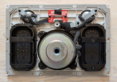 Quelques minutes suffisent ainsi pour démonter la grille de plastique qui protège les haut-parleurs, puis pour retirer le baffe – le panneau qui les soutient – et accéder aux entrailles de la Mynd. L'occasion de vérifier que Teufel a bien conçu son produit: non seulement la batterie est facilement accessible remplaçable, mais en plus, tout est proprement et soigneusement assemblé, avec de belles cartes électroniques, des nappes et des connecteurs solides et un joint d'étanchéité solide. Du beau travail, digne de la réputation du constructeur allemand !