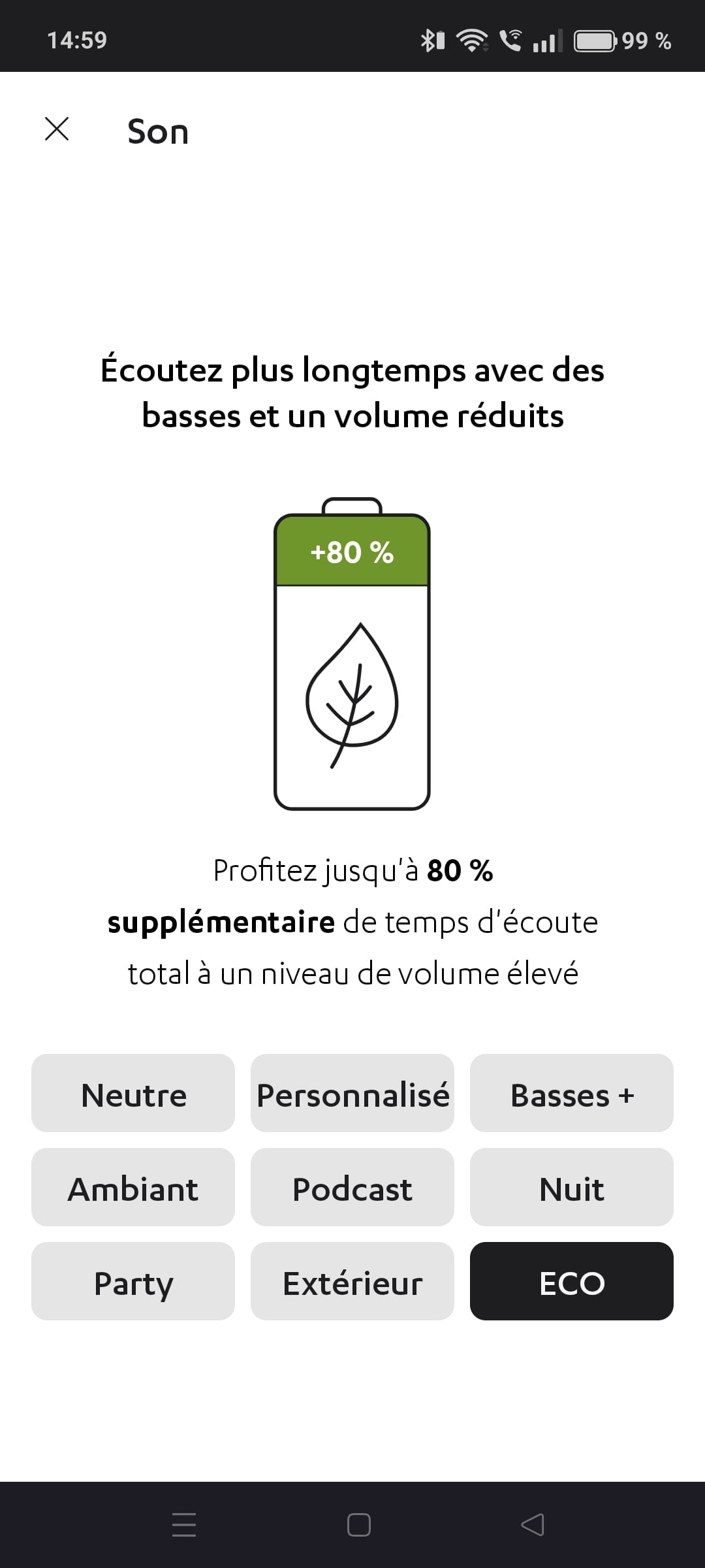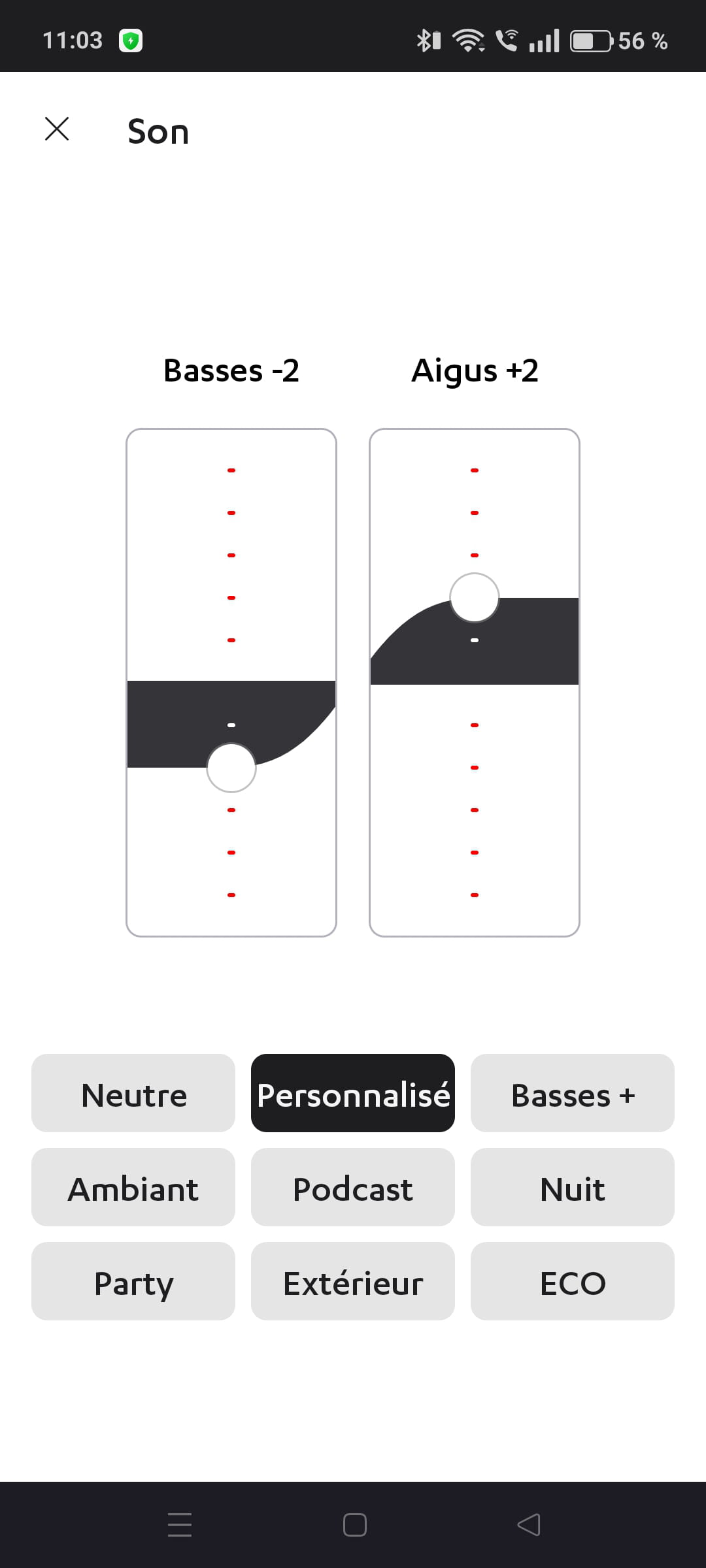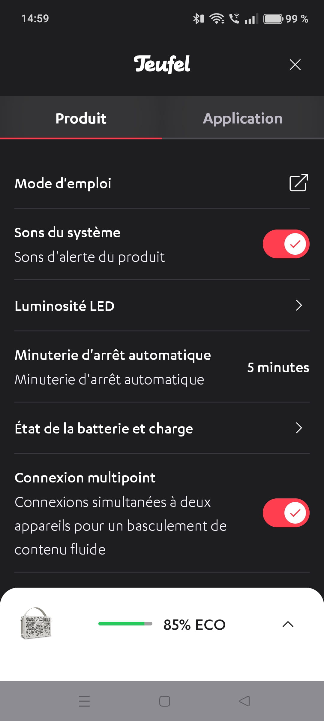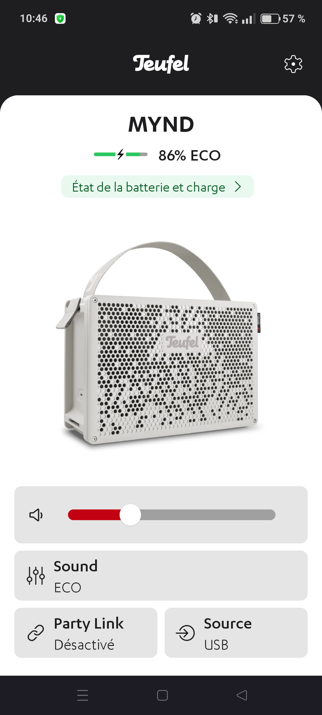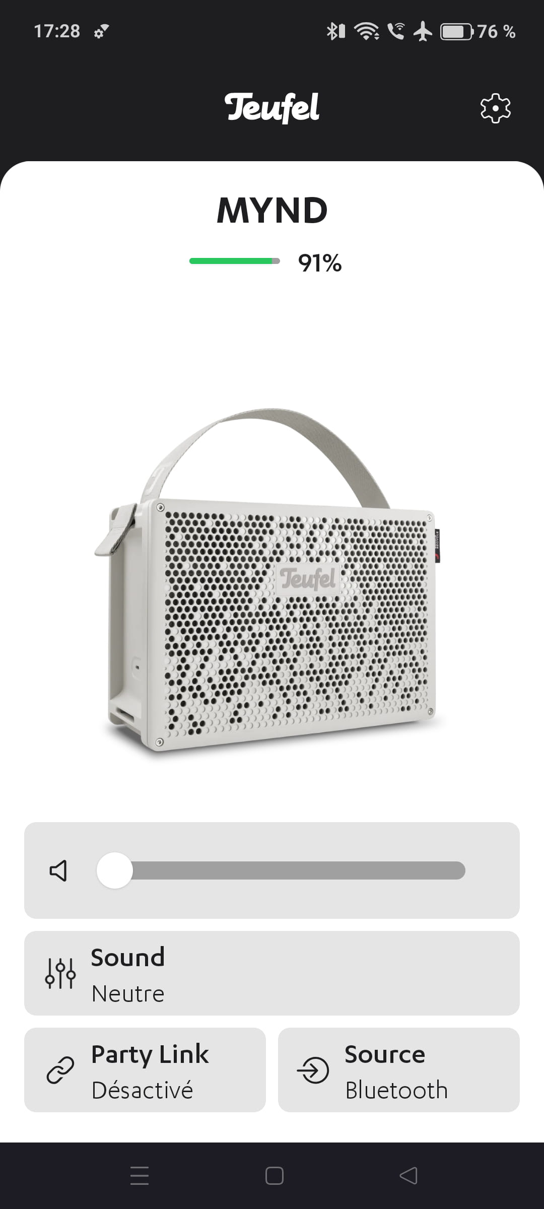 L'appairage Bluetooth est d'une simplicité exemplaire. Il suffit d'allumer la Mynd pour qu'elle se déclare automatiquement sur un appareil à proximité : on valide, et c'est tout ! Une opération à la portée d'une enfant. Il est alors proposé et conseillé de télécharger l'application Teufel Go qui permet d'ajuster quelques paramètres à distance, notamment la source (Bluetooth, Auxiliaire ou USB), le volume et l'égalisation, avec plusieurs présélections (Neutre, Ambiant, Nuit, Basse+, Party, etc.) dont une personnalisable – mais avec seulement des réglages de graves et d'aigus, soit le strict minimum.
