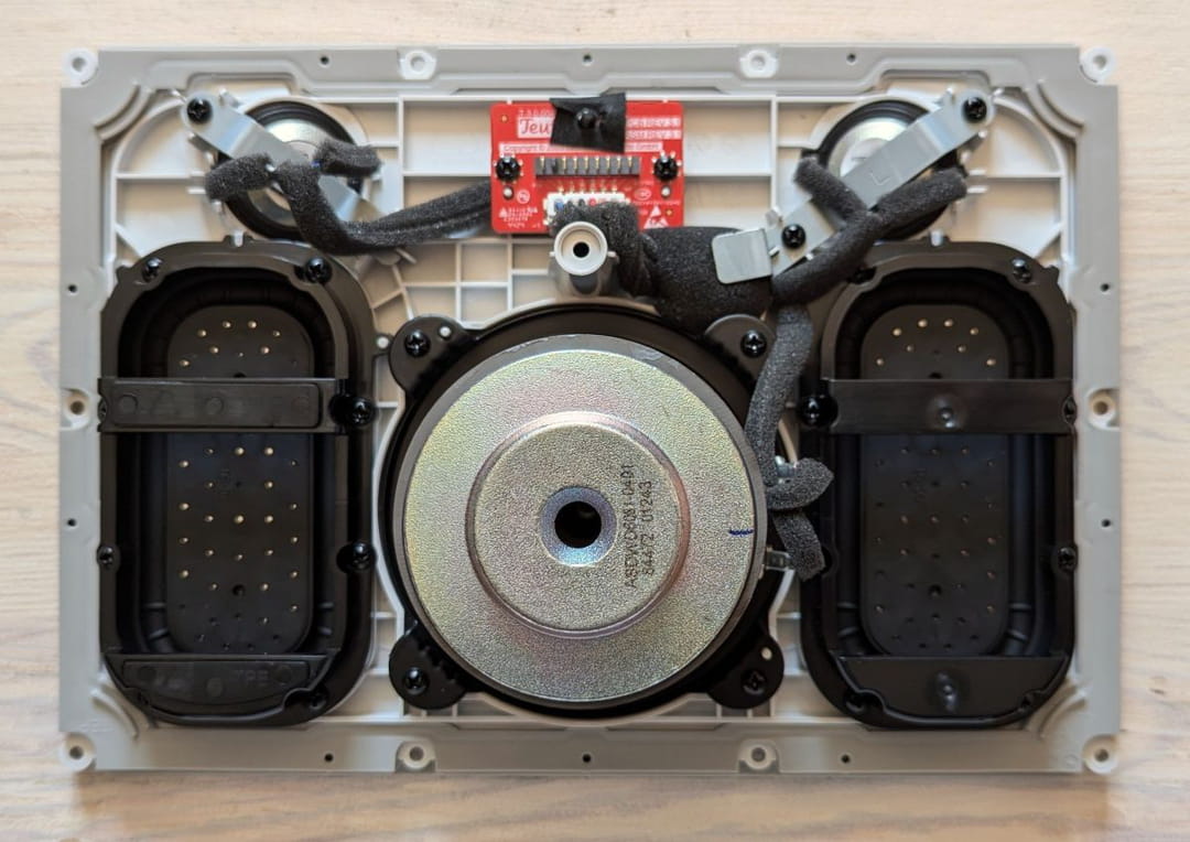 La partie acoustique est confiée à une paire de petits tweeters à dôme de 20 mm montés dans des amorces de pavillon associés à un unique boomer/médium de 90 mm à membrane en tissu. Cette section "active" – car alimentée par l'ampli – est complétée par une paire de petits haut-parleurs rectangulaires de 100 mm "passifs"– sans bobine ni aimant, donc – qui viennent épauler le transducteur central par simple compression mécanique. Un dispositif astucieux – mais pas exclusif à Teufel – qui permet de récupère des graves dans une enceinte close, un peu comme un évent le fait en bass reflex. L'ensemble fonctionne bien entendu en stéréo, sur deux canaux donc, même si l'électronique de type 2.1 assure une répartition sur trois voies – les trois haut-parleurs "actifs".