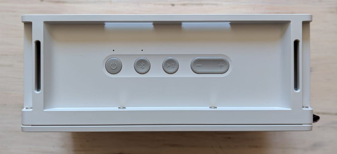 Côté commandes et connexions, Teufel a fait dans la simplicité. Le panneau supérieur accueille ainsi quatre gros boutons très agréables ç manipuler, accompagnés de Led témoin, pour les fonctions de base : Marche-Arrêt et niveau de batterie, Appairage Bluetooth et sélection de source, et Lecture/Pause/Suivant et Volume +/-. Rien de compliqué à comprendre et à utiliser.