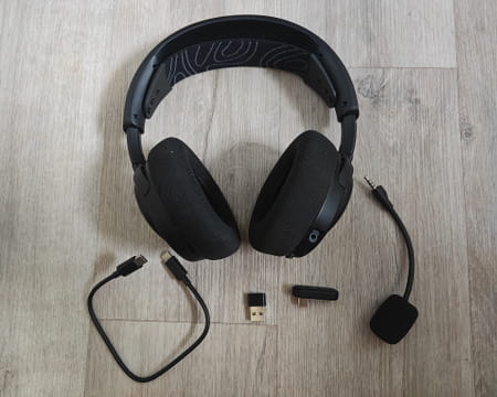 La grande différence avec le Nova 5 se trouve au niveau du micro, qui est amovible, et non plus rétractable. Certes, c'est moins pratique, mais il s'agit là d'un mal nécessaire afin de proposer un casque à un prix plus abordable. Notons que, cette fois, il n'y a pas de LED d'indication au bout de la perche afin d'indiquer si le microphone est allumé ou non. En plus du casque et du micro, l'Arctis Nova 3 Wireless est livré avec un câble de charge USB-C vers USB-C, un dongle 2,4 GHz USB-C et un adaptateur USB-C vers USB-A, pour pouvoir brancher le dongle sur les consoles.