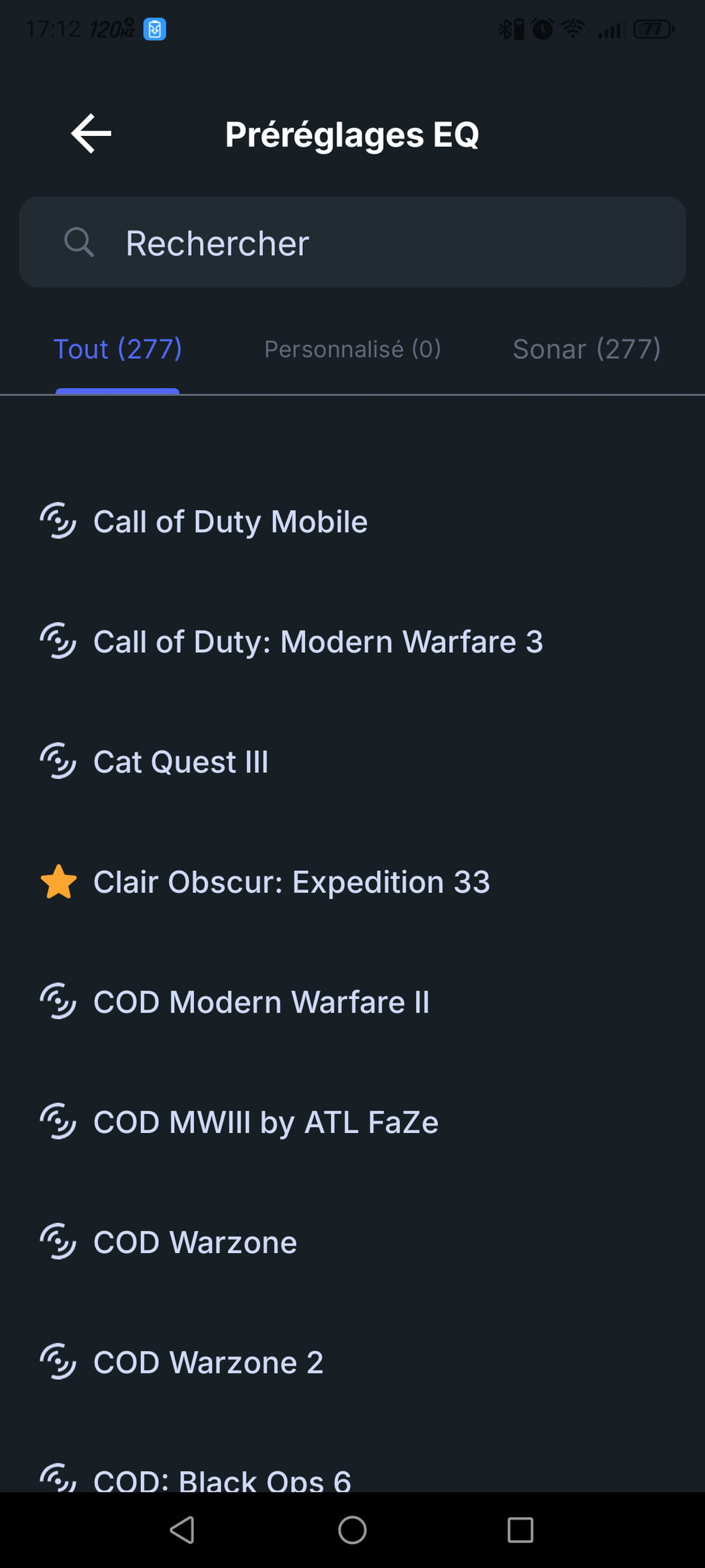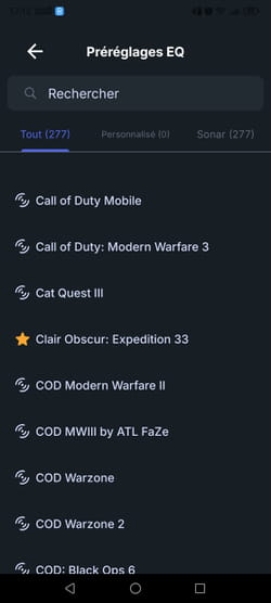 Mais revenons à nos préréglages audio, réalisés avec des équipes eSports comme FaZe Clan ainsi qu'avec différents éditeurs (Ubisoft, Valve, Bungie, Blizzard, etc.). Ils permettent de choisir le meilleur rendu sonore pour le jeu vidéo auquel on joue. On retrouve les jeux les plus populaires (Fortnite, League of Legends, Mario Kart World, Minecraft, Over, Roblox, World of Warcraft, Genshin Impact), les derniers AAA dans différents genres de jeu (Astro Bot, Assassin's Creed Shadows, Final Fantasy VII Rebirth, Hogwarts Legacy, Alan Wake II, The Legend of Zelda : Tears of the Kingdom, Resident Evil 4 Remake, Rise of the Ronin, Split Fiction, Clair Obscur : Expédition 33...), des jeux mobiles (Animal Crossing : Pocket Camp, Call of Duty Mobile, Pokemon GO), mais aussi plusieurs modes de musique (Bright, Clear Vocals, Deep Bass, Punchy) et de film (Clear Dialogue, Immersion). Il est également possible d'importer ses préréglages personnels ou d'en mettre certains en favoris, pour les retrouver plus rapidement. Après, il est dommage qu'on ne puisse pas vraiment se rendre compte visuellement de la différence entre chaque préset – pas d'autre choix que de faire confiance au constructeur. Alors ce n'est pas l'argument de force majeur, celui qui va nous faire acheter ce casque plutôt qu'un autre, mais c'est un bonus appréciable.