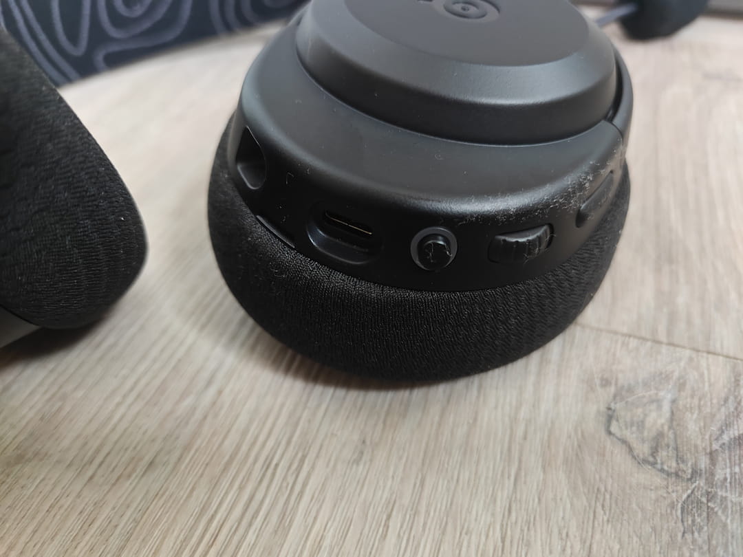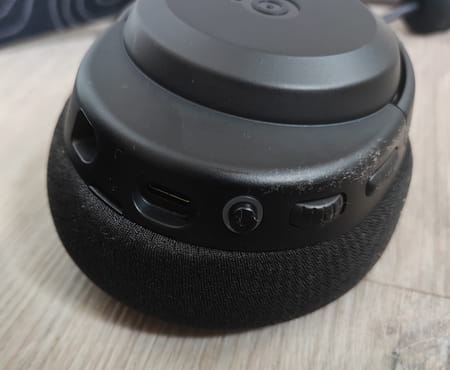 Cette fois, les contrôles se concentrent au niveau de l'oreillette gauche. On y trouve un bouton d'alimentation lumineux, une molette d'ajustement du volume, un bouton "Silence" permettant de couper la captation du microphone, un port de charge USB-C et un bouton permettant de basculer entre les différents modes de connexion (Bluetooth et 2,4 GHz).