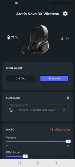 Comme son grand frère, l'Arctis Nova 3 Wireless est compatible avec l'application mobile du constructeur, lancée l'année dernière. En un an, celle-ci s'est enrichie de nouveaux préréglages audio et accueille aujourd'hui pas moins de 200 présets, qui permettent aux joueurs d'adapter le rendu sonore selon leurs préférences. Elle permet aussi de régler le volume, de choisir le mode de connexion et la luminosité de la LED du bouton Muet, de consulter le pourcentage de batterie, d'activer ou de désactiver le limiteur audio, ou encore de passer en mode "Plage étendue", qui réduit la qualité audio du microphone pour augmenter la portée de la connexion sans fil.