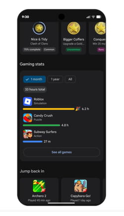 Google en profiter pour déployer un nouveau profil de joueur afin que les utilisateurs puissent suivre facilement leurs statistiques et leurs trophées à travers les jeux et les appareils. Il est même possible de générer un avatar via l'IA. Le géant du numérique n'oublie pas l'aspect convivial du gaming et lance Play Games Leagues, afin de pouvoir défier ses amis et la communauté Play tout en gagnant des récompenses. Enfin, Google déploie sur les smartphones le Play Games Sidekick, un menu superposé qui s'ouvre en pleine partie pour organiser les informations de jeu pertinentes et fournir un accès direct à Gemini Live, qui pourra donner des conseils de jeu en temps réel grâce au partage d'écran.