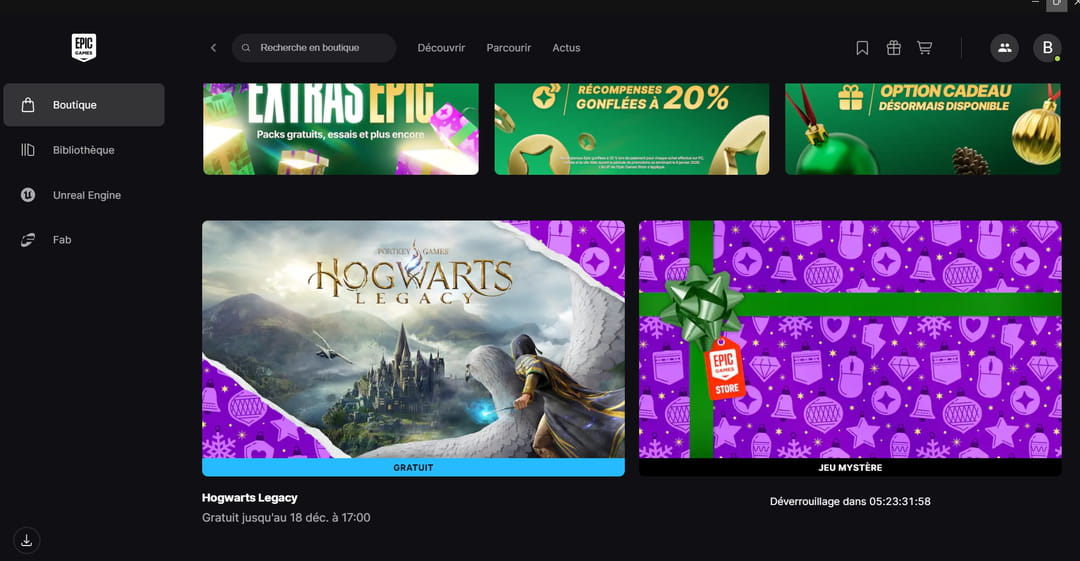 Le premier jeu gratuit n'est autre que le très apprécié Hogwarts Legacy : L'Héritage de Poudlard, un RPG à monde ouvert dans l'univers d'Harry Potter. Vous avez jusqu'au 18 décembre prochain, à 16h59, pour les ajouter à votre bibliothèque. À 17h pile, il sera de nouveau payant, tandis que le prochain jeu sera débloqué, et ainsi de suite. Voilà un Noël qui commence bien !