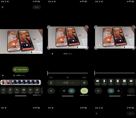 La nouvelle interface reprend, bien évidemment, les caractéristiques communes de Material 3 Expressive. En conséquence, la frise de montage — la timeline vidéo — est plus grande, avec une ligne verticale qui remplace l'icône circulaire de défilement. Les curseurs de réglages sont plus imposants et donc plus visibles, encadrés par une boîte à outils en forme de pilule arrondie au lieu d'icônes circulaires ou carrées, ce qui rend le tout plus élégant. Enfin, des icônes de coche et de croix viennent remplacer les boutons "Enregistrer une copie" et "Annuler", afin d'alléger le tout.